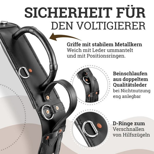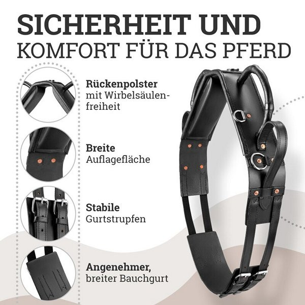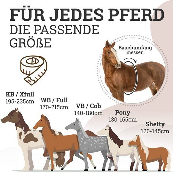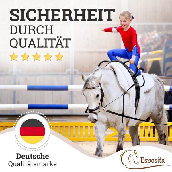 Különböző méretek és alkalmazásokA fekete heveder többféle méretben kapható, amelyek a ló vagy póni derékbőségéhez igazodnak. A Shetty méret 140-175 cm, a póni 165-200 cm, a VB / Cob 185-225 cm, míg a WB / Full 200-250 cm derékbőséghez megfelelő. Az extra nagy (KB) méret is elérhető. Az oldalra szerelt D-gyűrűk lehetővé teszik a kiegészítő gyeplők, például az Ausbinder rögzítését. Ajándékozza meg gyermekét egy biztonságos és élvezetes lovas élménnyel az Esposita boltíves heveder segítségével.